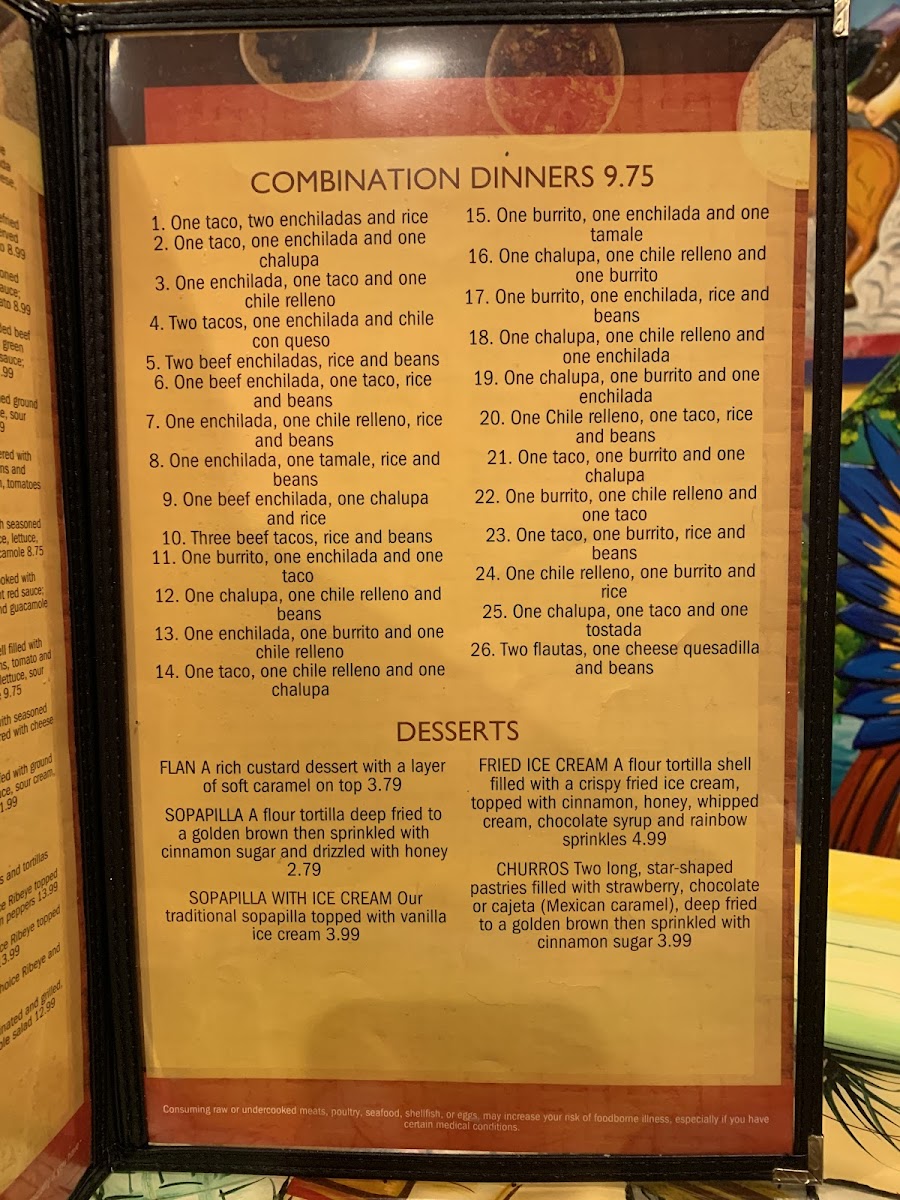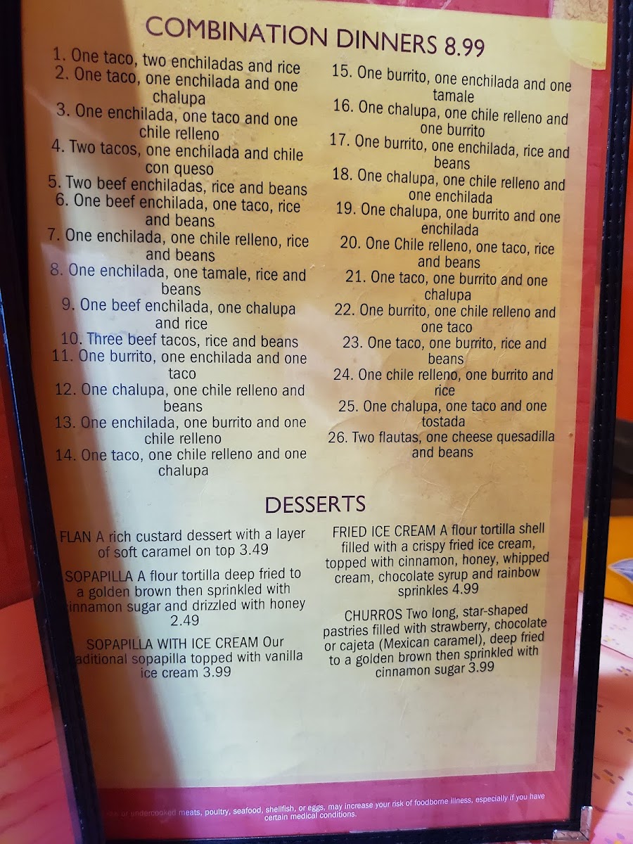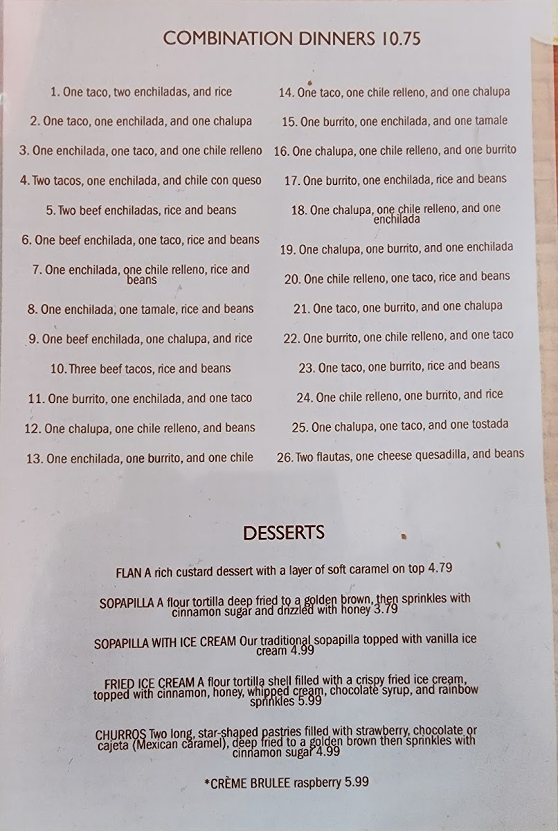 Desserts are a sweet treat to end your meal. Flan ($3.99), Sopapilla ($3.99), and Sopapilla with Ice Cream ($4.99) are fan favorites, along with Fried Ice Cream ($5.99) and Churros ($3.99).