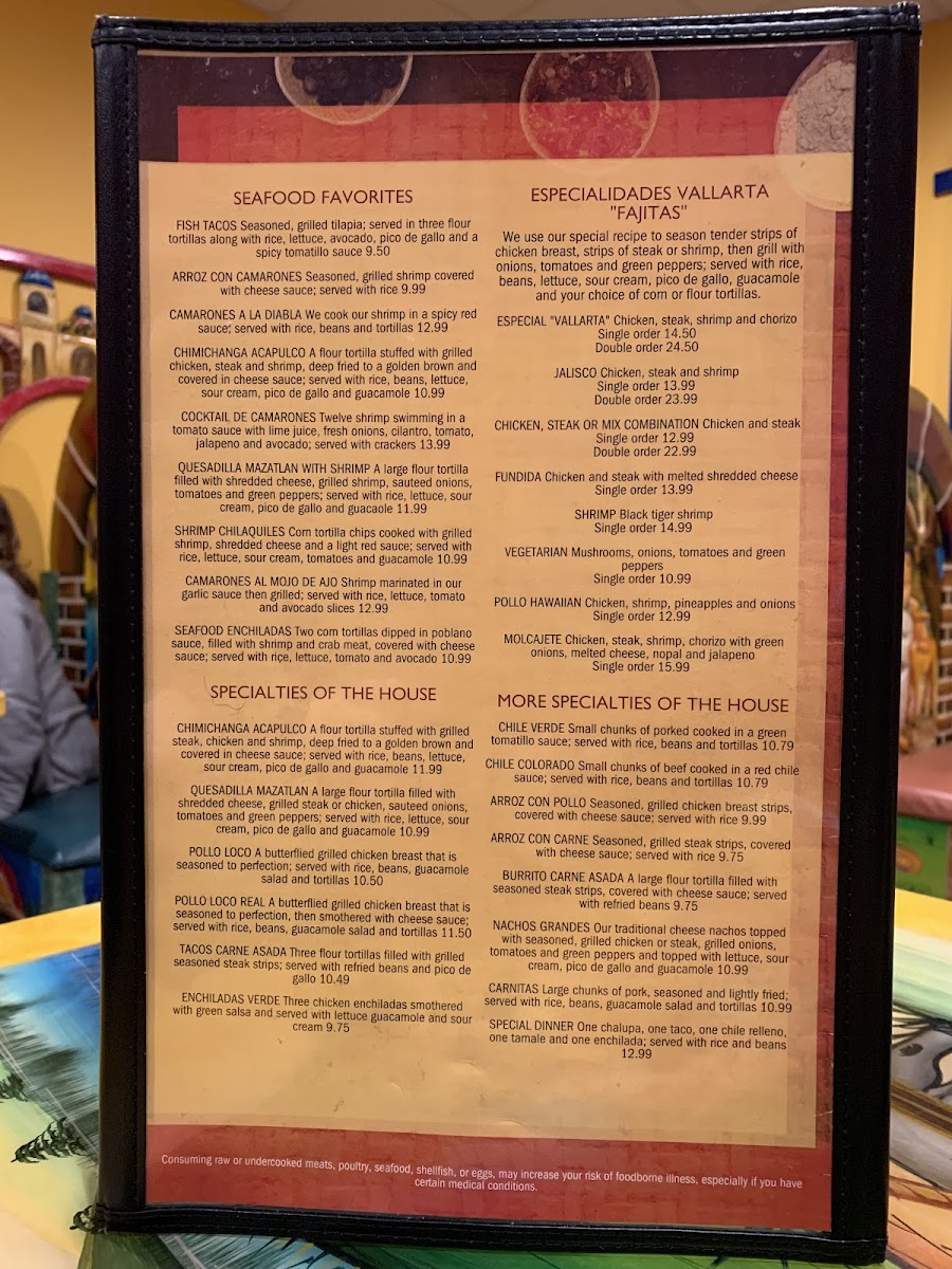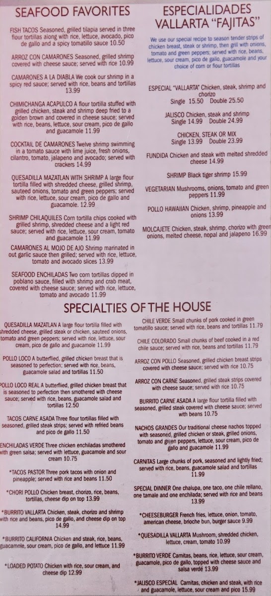 Finally, their Especialidades Vallarta Fajitas come in various options, including Chicken, Steak, or Mix ($12.99), Shrimp ($13.99), and even a Vegetarian Fajita ($10.99).