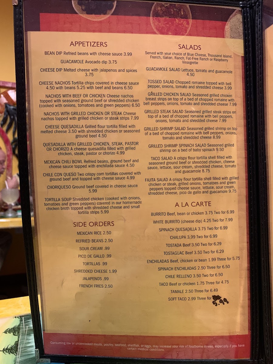 Starting with appetizers, Bean Dip ($3.99), Guacamole ($4.99), and Cheese Dip ($3.99) provide a perfect beginning to your meal. If you're in the mood for something crispy, the Cheese Nachos ($5.99) or Nachos with Beef or Chicken ($6.99) are great choices.
